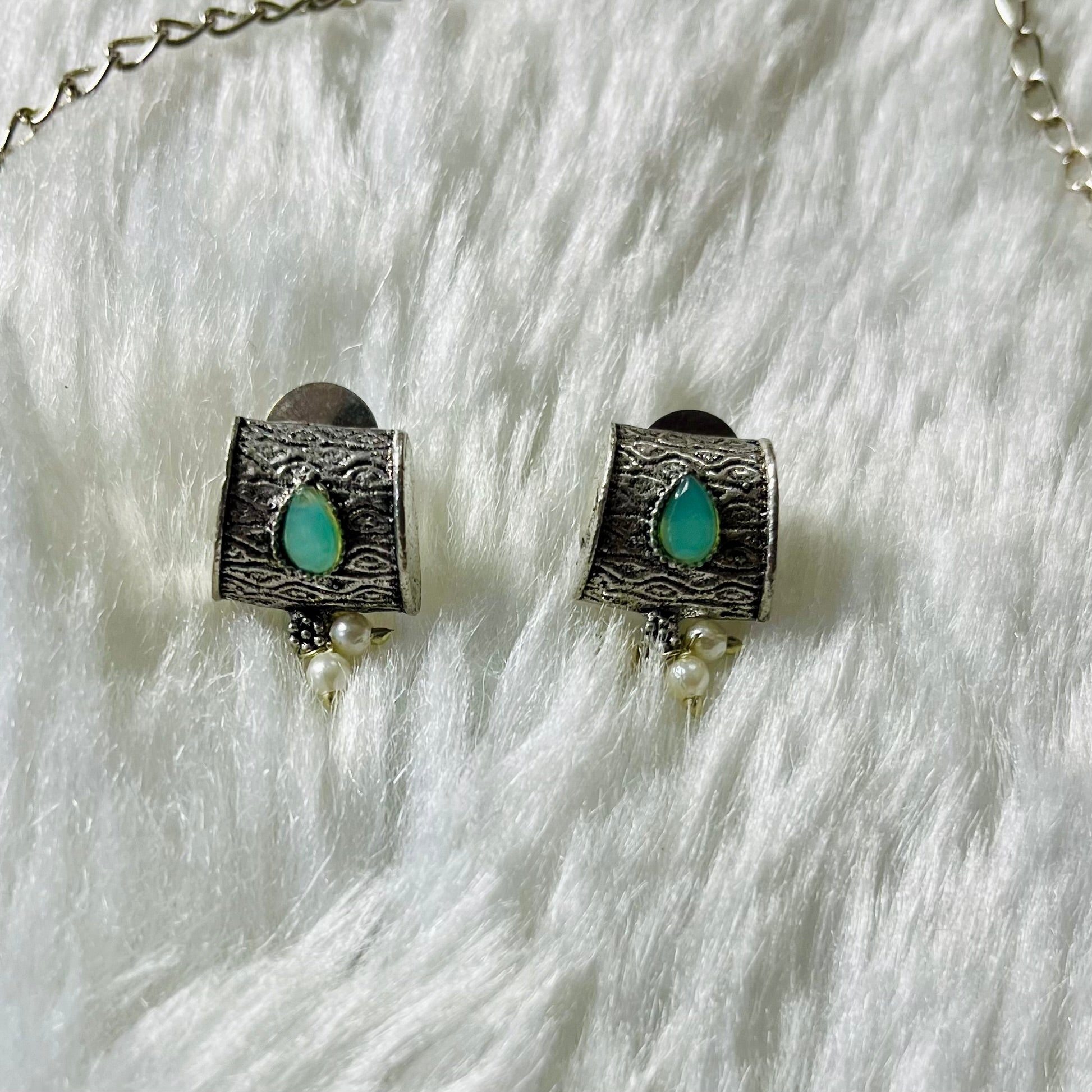 Featuring intricately carved silver-toned motifs adorned with colorful teardrop stones and delicate pearl hangings, this set brings together tradition and vibrancy.